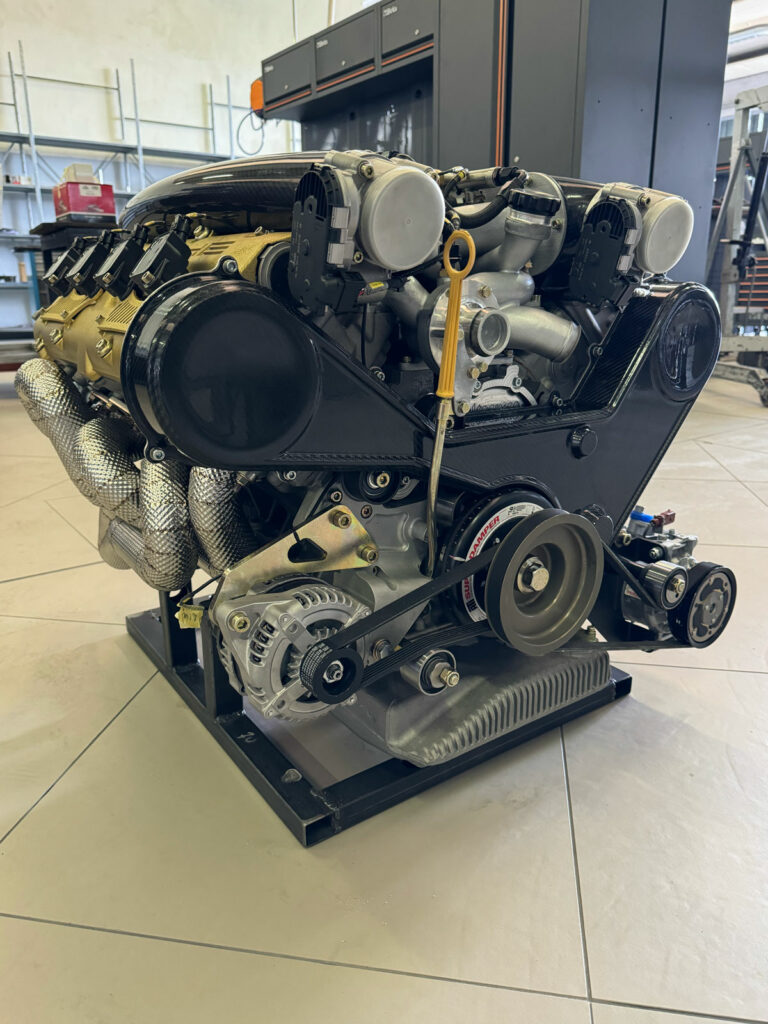 Interamente riprogettato a partire da basamento, testate ed albero motore originali, con il resto delle componenti realizzate da zero, l’otto cilindri è capace di erogare oltre 450 cavalli e più di 520 Nm di coppia.