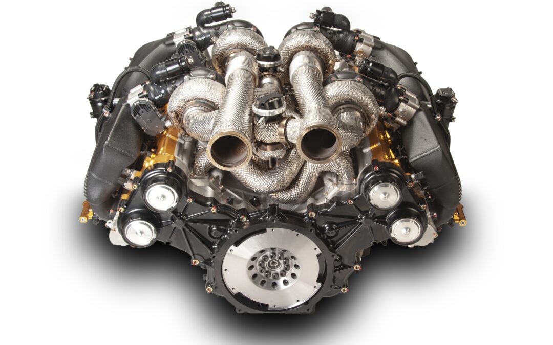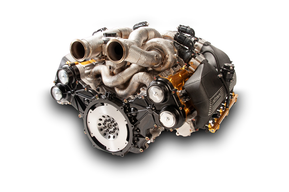 Il requisito principale per il V12 era la potenza: 1.500CV nelle versioni iniziali, con l’intenzione di aumentare ulteriormente in futuro, da qui la grande cilindrata e i quattro turbocompressori. Le esigenze di ingombro della vettura hanno determinato la caratteristica più insolita del motore: l’angolo a V di 120°. Questa configurazione, unita ad un layout “Hot-V” ha permesso di alloggiare in maniera compatta all’interno della V4 turbocompressori di taglia idonea alla potenza erogata dal motore e di progettare un sistema di scarico efficiente in grado di massimizzare il rendimento volumetrico del motore. L’ampio angolo a V offre anche benefici dinamici, abbassando notevolmente il centro di gravità. A parte i turbo, che sono la parte più alta, tutto il resto è molto basso, quasi al di sotto delle ruote.