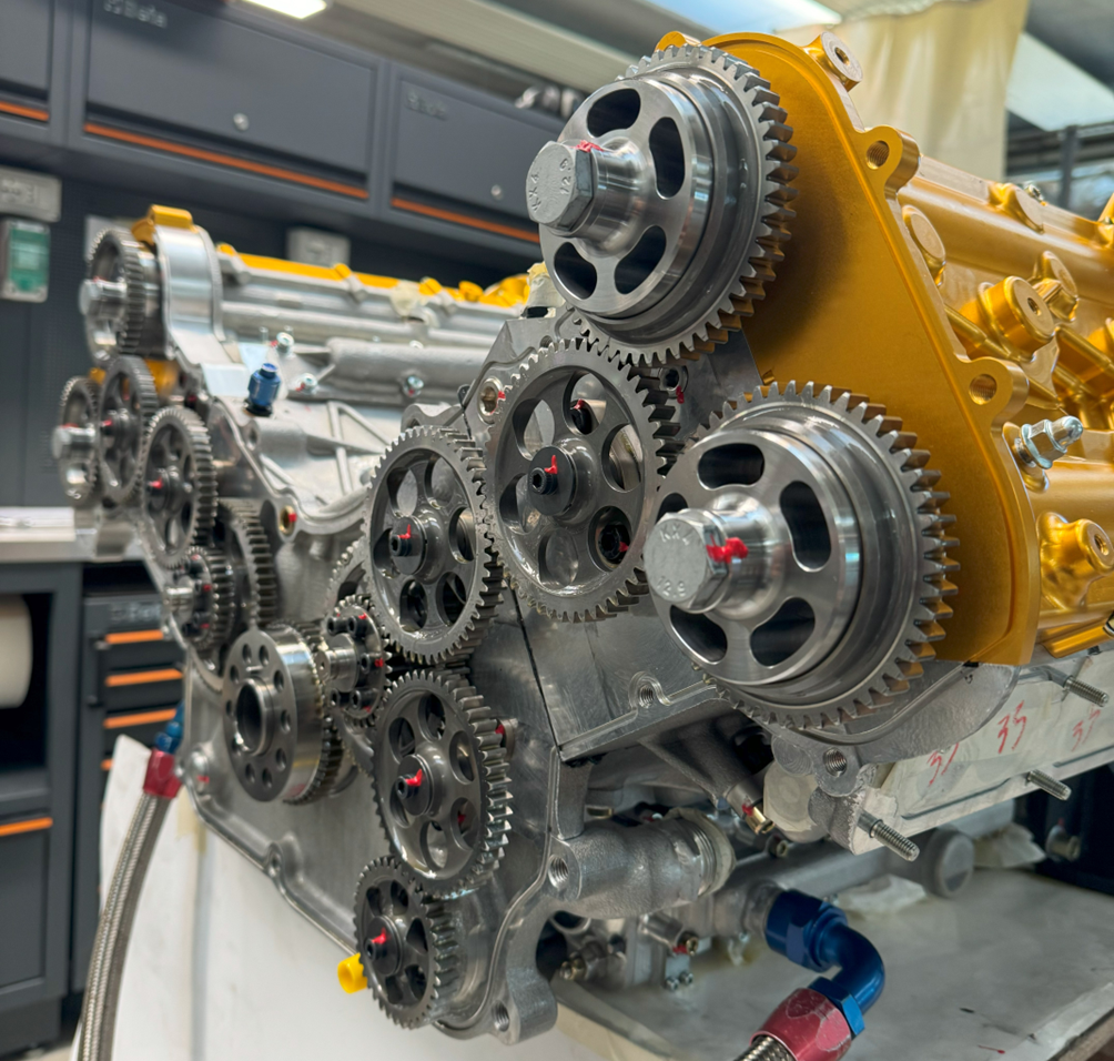 Il valvetrain si affida a una trasmissione a ingranaggi per i quattro alberi a camme. Non ci sono cinghie o catene all’interno del motore, ad eccezione di quelle per l’alternatore e il compressore dell’aria condizionata. La scelta è caduta su punterie a bicchierino piuttosto che sulla soluzione più estrema dei bilancieri a dito. Questi ultimi sono, tipicamente, necessari per regimi molto alti con profili di camme aggressivi per mantenere il corretto contatto valvola-punteria. L’attenzione principale con questi motori di grandi dimensioni è garantire la rigidità dei componenti (blocco, albero motore, teste, ecc.) e controllare il loro movimento relativo: si è lavorato molto per togliere materiale nelle zone meno sollecitate senza alterare la rigidezza complessiva del motore.